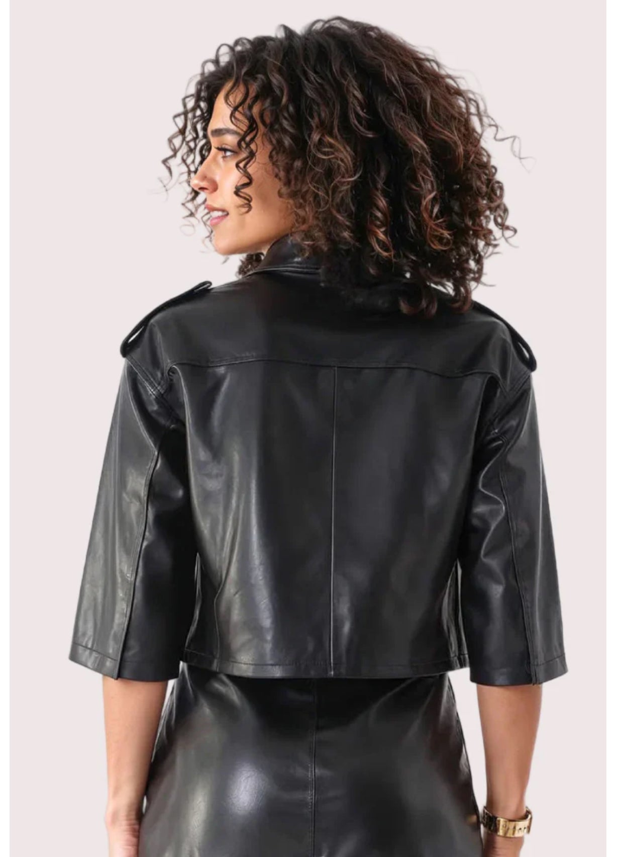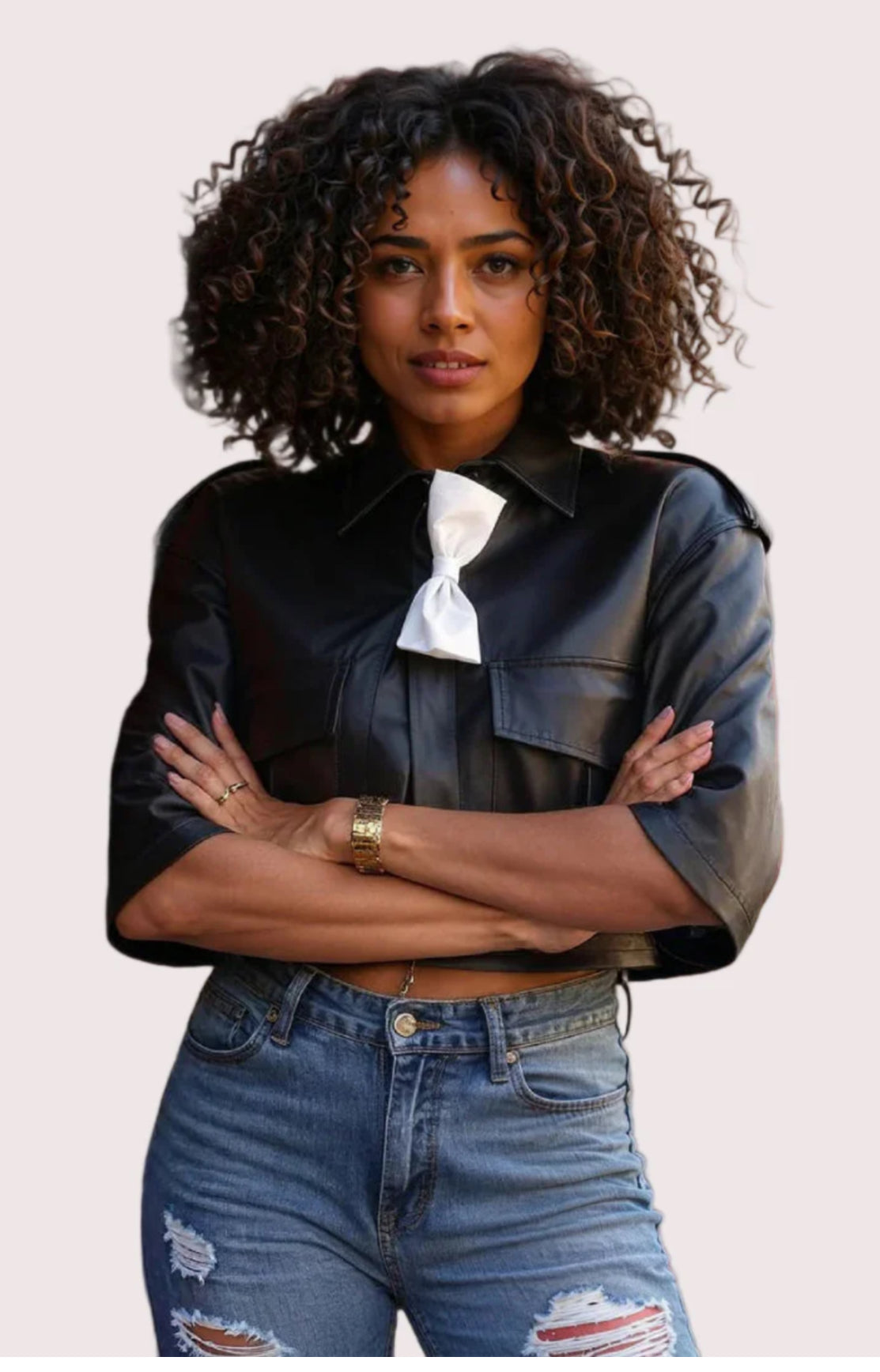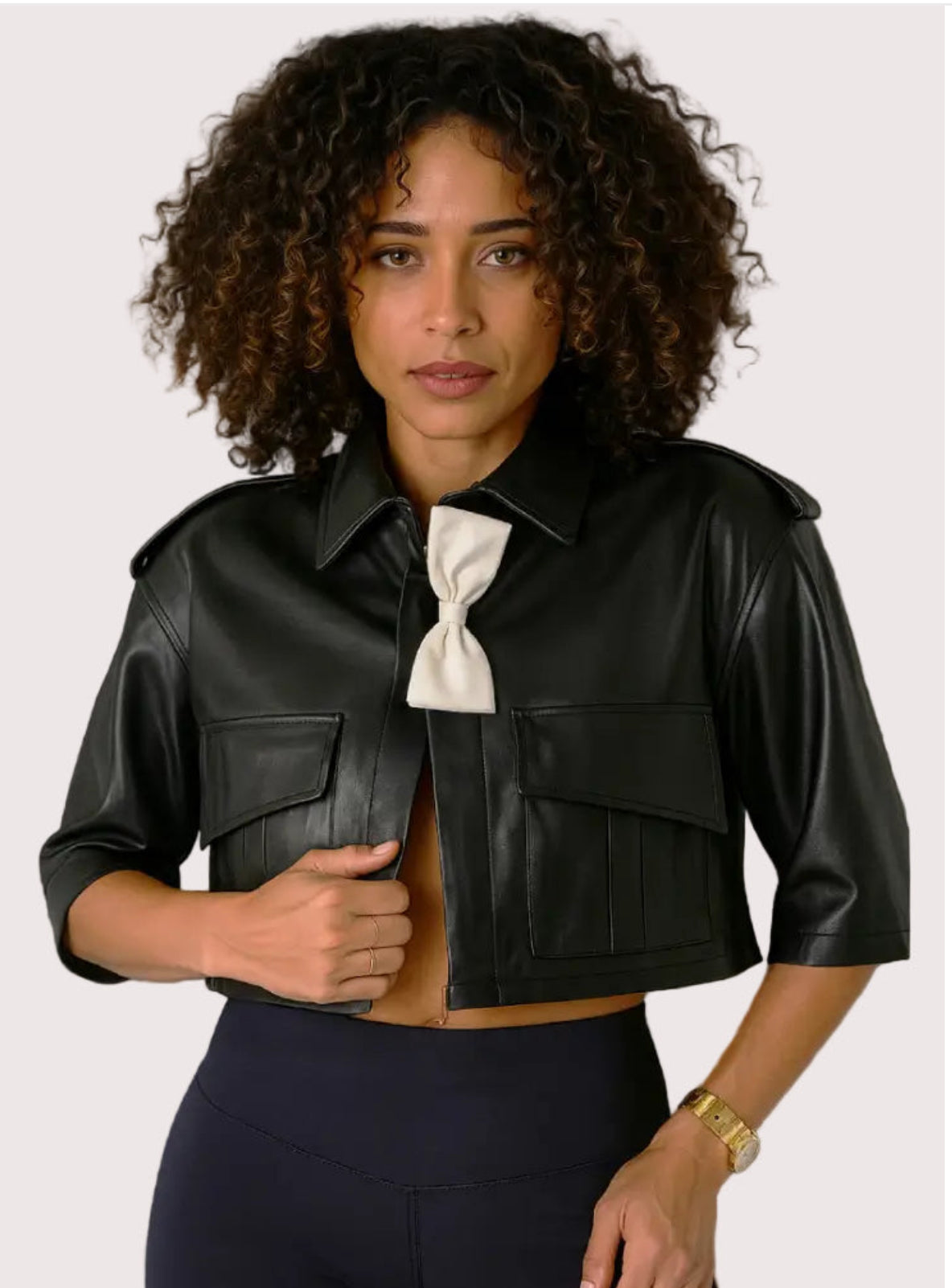 BLACK CROPPED LEATHER JACKET WITH BOW